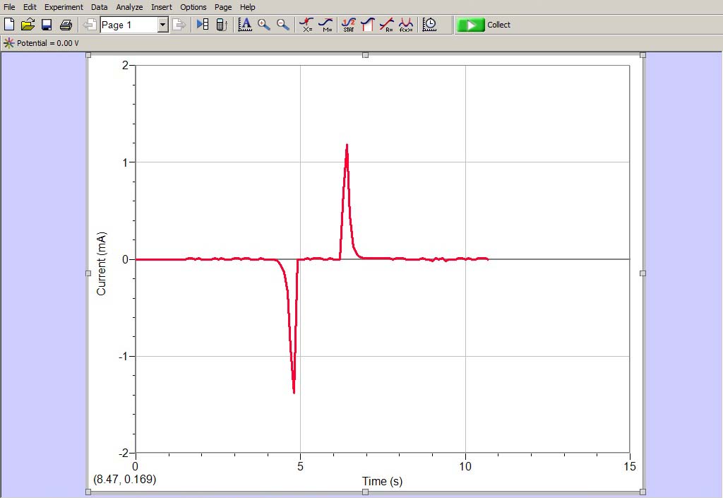 Connect a voltage sensor to LabQuest CH 1. Connect the sensor input across a coil of wire. Connect a 1000-ohm resistor across the sensor input. Open voltage1induced.cmbl in Logger Pro. For this application, you may want to zero the sensor. Click on the green button to start the plot. The plot lasts for 15 seconds. The figure above was generated by inserting a magnet into the coil and then removing the magnet from the coil. Note that the y axis is labeled "current" even though we are actually measuring the voltage across the 1000-ohm resistor. If we measure 1 V across the resistor, then 1 mA is flowing through the resistor and through the coil.