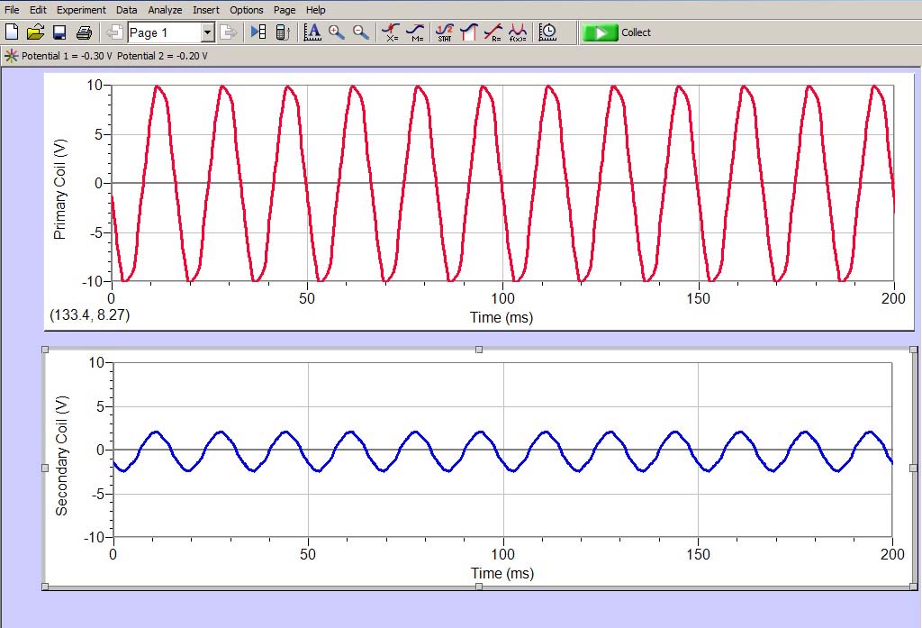 Connect one voltage sensor to LabQuest CH 1, and connect its input across the primary coil of a transformer. Connect the other voltage sensor to LabQuest CH 2, and connect its input across the secondary coil of the transformer. Open voltage2transformer.cmbl in Logger Pro. Click on the Data Collection icon just to the left on the green Collect button on the tool bar. Check the box for Repeat. This causes a new plot to start automatically after each plot is finished. (When you finish this demonstration, uncheck the Repeat box before you close Logger Pro; otherwise it will still be active the next time you open Logger Pro.) Click on the green button to start the plots. Each plot lasts for 0.2 seconds. The figure above was generated by applying an AC signal (10 V amplitude) to the primary coil. The secondary coil was loosely coupled to the primary coil.